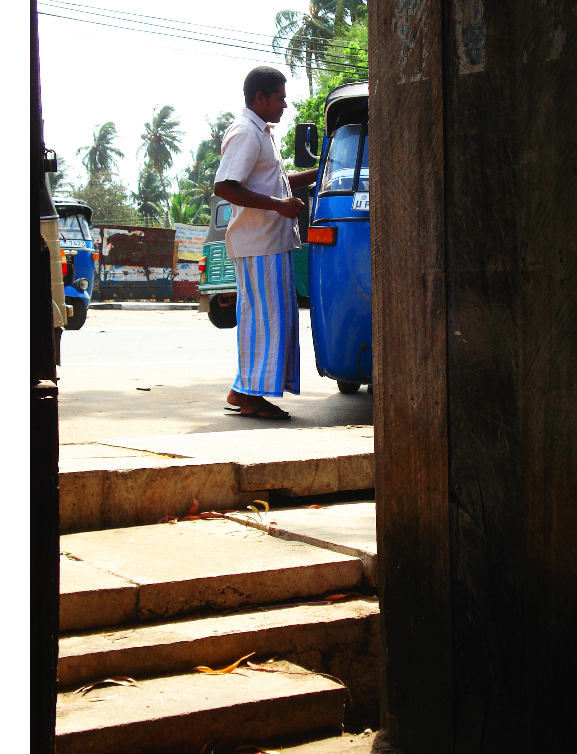 Street level Pottuvil - men in sarongs and tuk-tuks