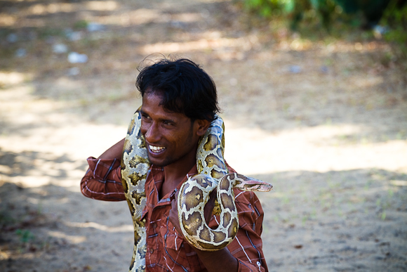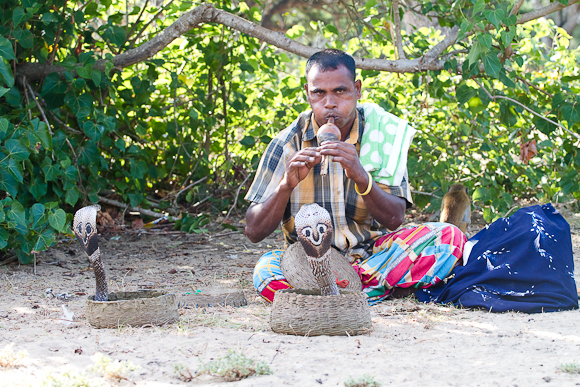 Trudging up the beach with five local surfers, our surfboards and Sean’s camera gear, in search of waves for our photo shoot, we stumbled upon two snake charmers and their monkey. Two ragged wicker baskets, resembling tortilla holders, sat inconspicuously on the sand. One of the gypsies sat cross-legged, forming a triangle with the baskets. Off to the right the monkey jumped up and down, eyes darting in all directions. The other gypsy, with longer hair, stood about five steps back with a python dangling from his neck.
