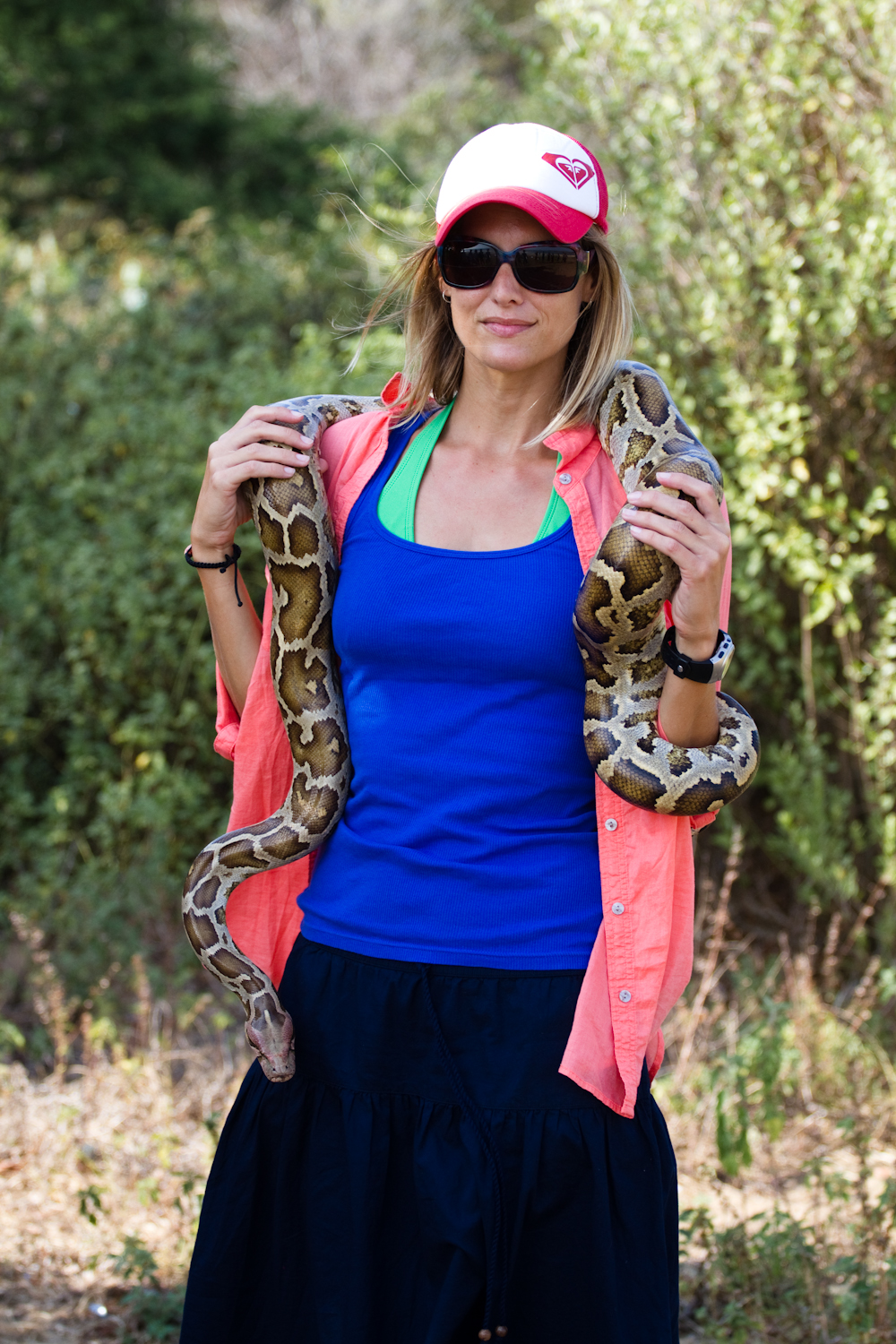 The tall gypsy, with large dark eyes, sauntered towards us wearing the beige and olive green colored python. Without asking, he draped the heavy snake around my neck like a scarf. Even though I had held many snakes, it had been about seven years since the last time. A shot of adrenalin surged through me but I calmed myself down. I have a theory about animals (and babies); they can sense your anxiety and will mirror your emotions. The best thing to do is just to remain calm.